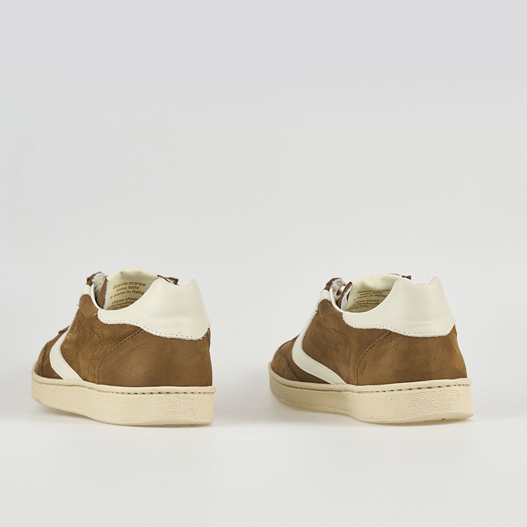 Tomaia in nabuk. Boomerang in pelle in diverse colorazioni. Suola a cassetta in gomma color miele. Fodera in pelle e lacci in cotone